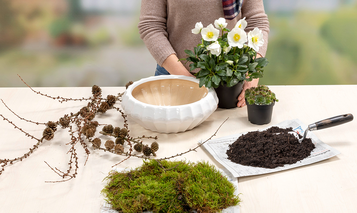 Wer das reine, klassische Weiß der Christrosenblüten liebt, kann sich oft auch in Sachen Dekoration für eine schlichte und klassische Variante begeistern. Für diese Puristinnen und Puristen unter den Winterblüher-Fans ist diese Art des Blumenschmucks mit Christrosen genau das Richtige. Im Solo-Auftritt, ganz schlicht in einer weißen, formschönen Keramikschale, kommt die klassische Schönheit der Christrose voll zur Geltung – ohne Schnick-Schnack und mit wenig Zutaten.