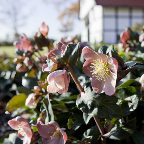 Helleborus x ballardiaeEin echter Blühmeister ist die sehr reichblühende, winterharte Schneerose Maestro®. Ab Dezember zeigt sie eine Fülle von bezaubernden cremerosa Blüten mit gelben Nektarien (Honigdrüsen). Die Blüten verfärben sich im Laufe des Winters dunkelrosa. Maestro® ist die ideale Wintertopfpflanze, geschmückt mit Fichtenzweigen und -zapfen und einem Stern aus Weidenruten hat man schnell ein edles Geschenk für die Weihnachtszeit. Im Garten fühlt sich Maestro® besonders an sonnigem Standort wohl und ist sehr pflegeleicht.
